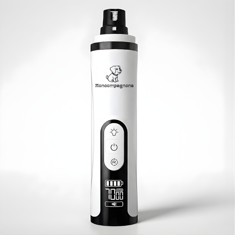 Notre broyeur est équipé d'une batterie longue durée et se recharge via un câble USB universel (inclus). Une charge complète prend généralement environ 2-3 heures et offre une autonomie de plusieurs heures d'utilisation continue, ce qui est amplement suffisant pour de nombreuses séances de toilettage. L'écran LCD vous indique le niveau de batterie en temps réel.